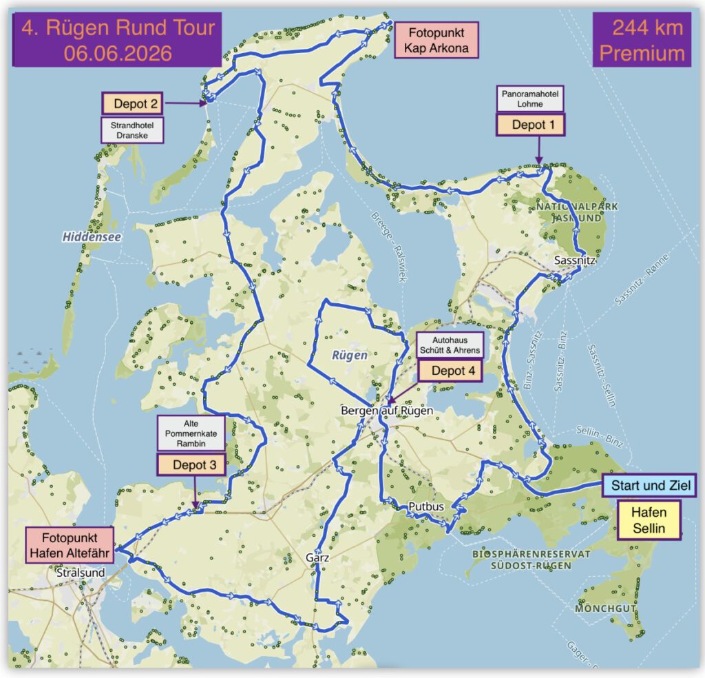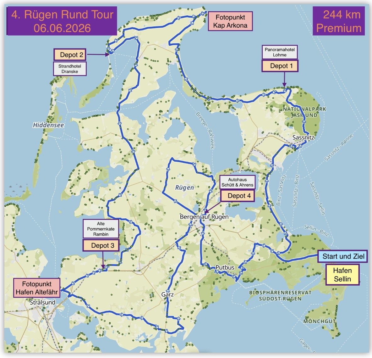 Auf der Seite sind jetzt auch die Infos zur vierten Ausgabe der Rügen Rund Tour zu finden. Neben der 244 km Strecke wird auch eine 87 km Tour angeboten, falls man die 244 doch zu heftig findet.